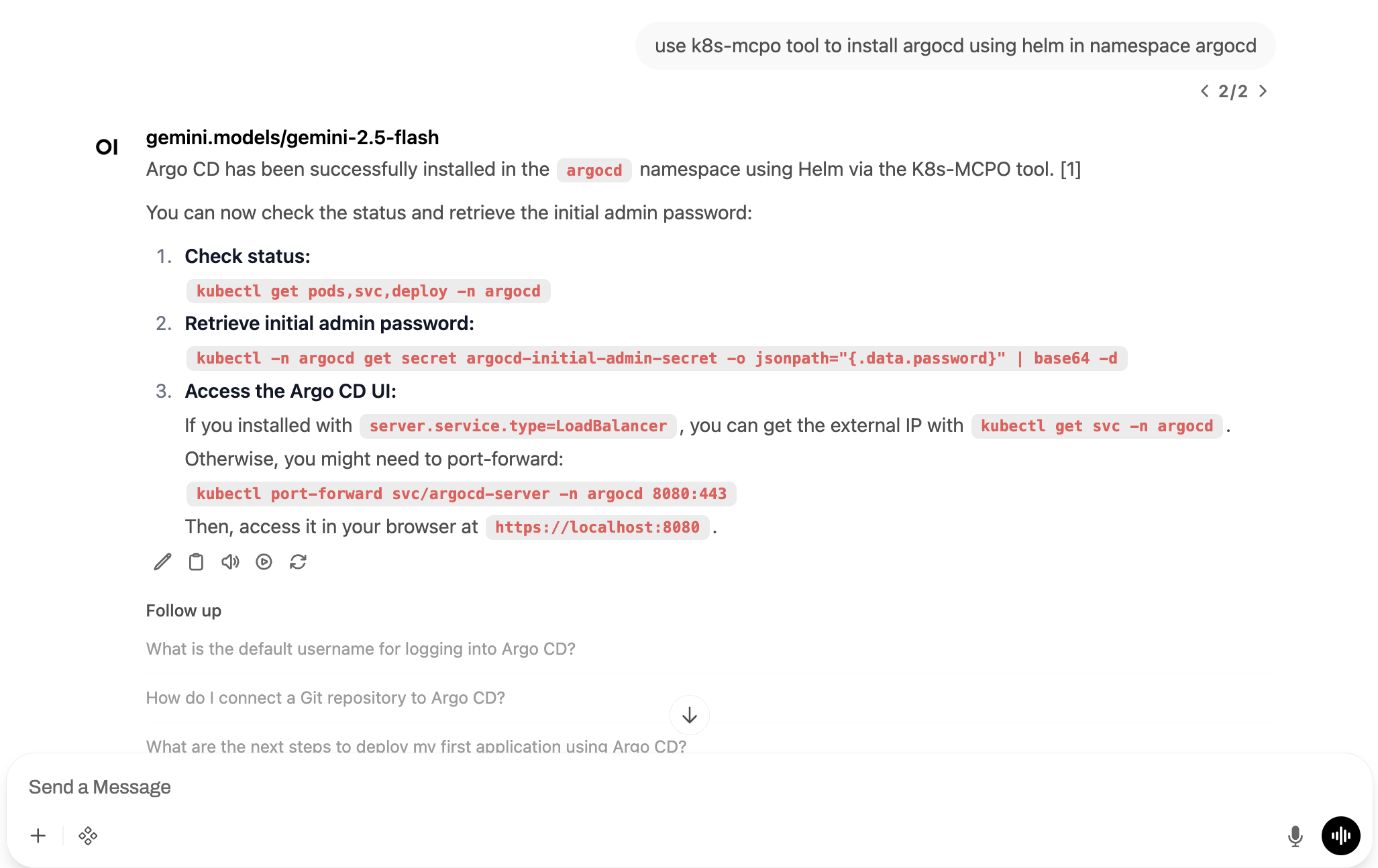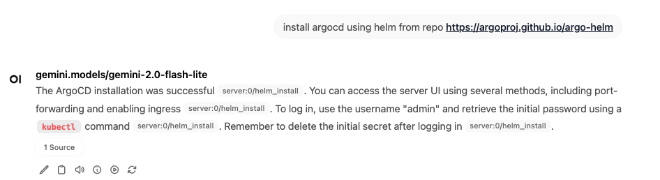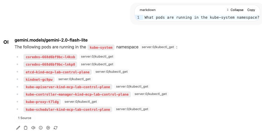 kubectl_get - List Kubernetes resourceskubectl_apply - Apply manifestskubectl_describe - Describe resourceshelm_install - Install Helm chartsTry asking these questions to verify everything works (copy and paste into the chat):