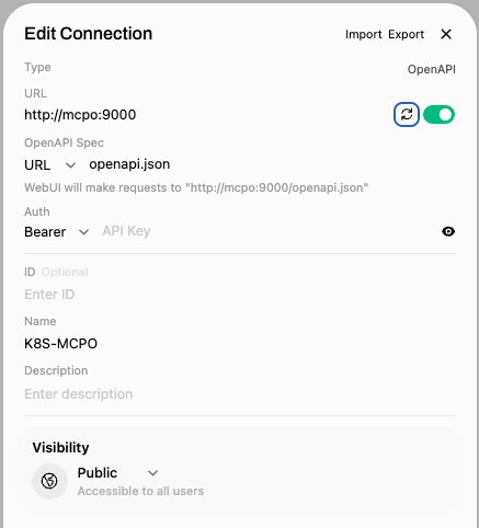 Chat with your Kubernetes cluster using natural language! This project connects OpenWebUI to Kubernetes, letting you manage your cluster through conversational AI. Ask questions like "What pods are running?" or "Scale my deployment to 5 replicas" and get instant results. - Quick Start - Configure Open-WebUI - Step 1: Access Open-WebUI - Step 2: Add the MCP Bridge Tool Server - Step 3: Add Connecti