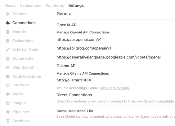 Configure your AI model connections - use the local Ollama or add remote connections: